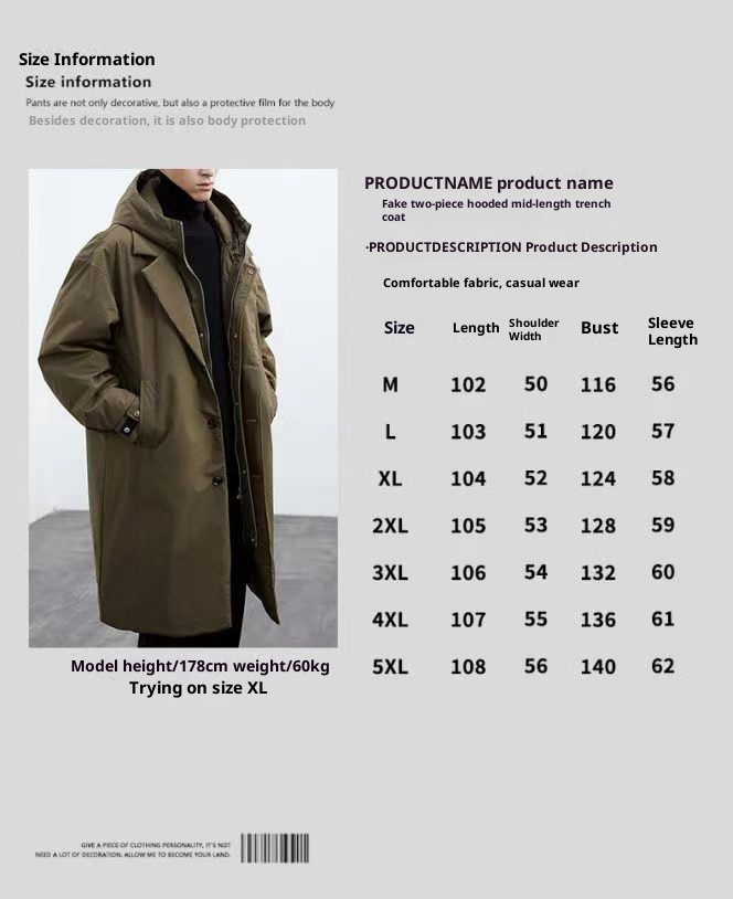 Men's False Two Pieces Hooded Mid-length Trench Coat